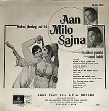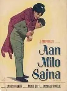 Aan Milo Sajna (transl. Come, my darling) is a 1970 Hindi-language musical drama film written by Sachin Bhowmick, produced by Jagdish Kumar and directed by Mukul Dutt. The film stars Rajesh Khanna and Asha Parekh in the lead roles and the supporting cast included Vinod Khanna, Rajendra Nath and Nirupa Roy. The music is by Laxmikant Pyarelal with lyrics by Anand Bakshi. The film became a super hit at the box office and the song "Acha to Hum Chalte Hain" was a phenomenon.[2] This film is counted among the 17 consecutive hit films of Rajesh Khanna between 1969 and 1971, by adding the two-hero films Marayada and Andaz to the 15 consecutive solo hits he gave from 1969 to 1971.[3] During the interval of other films released in 1970, when the trailer for Aan Milo Sajna, used to be played, crowds would erupt as soon as Rajesh Khanna arrived on the screen.[4]