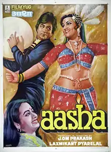 Aasha (transl. Hope) is a 1980 Indian Hindi-language drama film, produced and directed by J. Om Prakash under the Filmyug Pvt. Ltd. banner. It stars Jeetendra, Reena Roy, Rameshwari and music composed by Laxmikant Pyarelal. The film is recorded as a "Blockbuster" at the box office.[1] It was remade in Telugu as Anuraga Devatha (1982), in Tamil as Sumangali (1983)[2] and in Bengali as Mandira (1990).