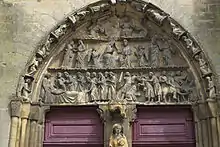 Two square towers surround the portal. The portal's tympanum, dating from the 13th century, is composed of three levels of sculpted decoration, separated by wavy bands, evoking, in medieval symbolism, the sky. The second floor depicts, on the left, the dormition of Christ's mother, and, on the right, the martyrdom of Victor de Mouzon and Arnoul de Mouzon.[21] The middle floor is devoted to three scenes from the iconographic tradition on the life of the Virgin Mary. On the left is the Visitation of the Virgin Mary, or visit that Mary, pregnant with Christ, would have made to her cousin Elizabeth, pregnant with John the Baptist. In the middle, the crowning of the Virgin, an episode unknown in the gospels according to Matthew, Mark, Luke, or John, but popular in the 12th and 13th centuries. This scene, relatively new in religious iconography, can also be found in the sculpted decoration of the tympanums of the cathedrals of Chartres, Senlis, Paris, and Laon. And on the right is the Annunciation, or announcement to Mary of her divine maternity by the Archangel Gabriel. The third floor, or upper floor, consists of kneeling angels. This is the area of the tympanum where the carvings have been most damaged, introducing more uncertainty about the interpretation. A figure seems to be pushed by an angel toward a divine being, perhaps God the Father, or Christ, to whom another angel holds out a crown. The figure thus presented to God for glorification could again be Victor, the martyr and patron saint of Mouzon.[12][21]