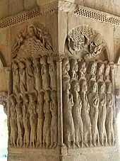 The southeast corner's pier relief depicts the Ascension and the Pentecost. The northeast corner's pier relief depicts the Entombment and the Descent from the Cross. The northwest corner's pier relief depicts the disciples of Emmaus. The southwest corner's pier reliefs depict the Annunciation to Mary and the Tree of Jesse.