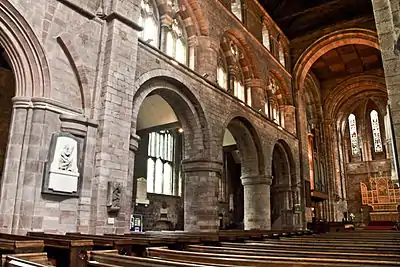 Shrewsbury Abbey was founded in 1083 by Roger de Montgomery, on the instance of Ordelirius, one of his clerks,[7][8] and using the site of St Peter's church, which Roger had previously granted to Ordelirius. The founding colony consisted of two monks brought from St Martin's Abbey in Séez, southern Normandy: these were Reginald and Frodo.[9][10] The first abbot, Fulchred (Foucher in modern French),[11] is not mentioned as present before the organised conventual life of the abbey was inaugurated. This was probably late in 1087, as Orderic Vitalis, son of Ordelirius the clerk, and very likely an eye-witness of the events,[12] attests that this was in the reign of William Rufus. Orderic describes Fulchred as "eloquent" and quotes at length an important specimen of his oratory. A monk of Gloucester Abbey had vision, in which a divine prediction of the imminent death of William Rufus was delivered.[13][14] Abbot Serlo wrote to the king, informing him of the vision. On the Feast of St. Peter ad Vincula, 1 August 1100, Fulchred was a guest preacher at Gloucester and mounted the pulpit to deliver a diatribe against the state of the country under Rufus.