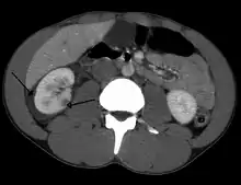 Abdominal trauma resulting in a right kidney contusion (open arrow) and blood surrounding the kidney (closed arrow) as seen on CT | |