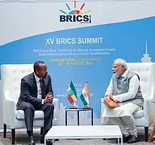 Abiy Ahmed Ali (Oromo: Abiyi Ahmed Alii; Amharic: አቢይ አሕመድ ዐሊ; born 15 August 1976) is an Ethiopian politician serving as the third Prime Minister of Ethiopia since 2018, and as a leader of the Prosperity Party since 2019.[1][2] He was awarded the 2019 Nobel Peace Prize "for his efforts to achieve peace and international cooperation, and in particular for his decisive initiative to resolve the border conflict with neighbouring Eritrea".[3] Abiy served as the third chairman of the Ethiopian People's Revolutionary Democratic Front (EPRDF) that governed Ethiopia for 28 years and the first person of Oromo descent to hold that position.[4][5] Abiy is a member of the Ethiopian parliament, and was a member of the Oromo Democratic Party (ODP), one of the then four coalition parties of the EPRDF, until its rule ceased in 2019 and he formed his own party, the Prosperity Party.[6][7]