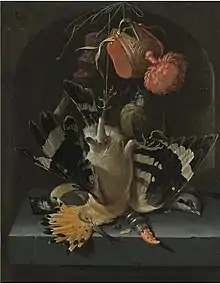 Mignon also took inspiration from Willem van Aelst and Otto Marseus van Schrieck in his game and insect pieces.[3] Willem van Aelst was clearly an inspiration for the game pieces while the influence of Otto Marseus van Schrieck is particularly visible in Mignon's forest floor still lifes.[8]