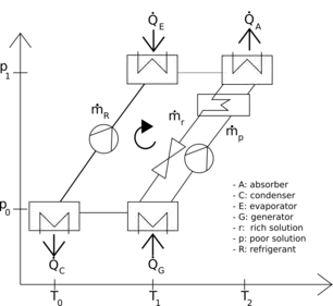For the absorption heat pump circulation, the absorber, generator and pump can be regarded as a "thermal compressor". The absorber is equivalent to the inlet side of the compressor, and the generator is equivalent to the outlet side of the compressor. The absorbent can be regarded as a carrier liquid that transports the generated refrigerant gas from the low-pressure side of the cycle to the high-pressure side.[5]