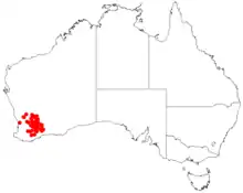 It is native to an area in the Great Southern and Wheatbelt regions of Western Australia where it is found among granite outcrops and sandplains growing in gravelly sandy, loamy or clay soils.[1] The bulk of the population of the shrub is found from around Wongan Hills in the north through to around Ongerup to around Lake King in the east where it is often situated as a part of woodland, mallee, shrubland or heathland communities.[2]