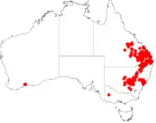 In Western Australia it is native to an area along the south coast near Ravensthorpe in the Goldfields-Esperance region of Western Australia where it grows in stony soil.[3] It is found in coastal and inland parts of New South Wales north from Lake Cargelligo and extends into southern parts of Queensland.[1]