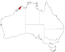 The range of the plant is entirely within Prince Regent Nature Reserve,[3] in the Northern Kimberley region[2] of Western Australia where two small disjunct populations are known. The shrub is often situated near creeks in fire-protected areas growing in shallow sandy soils over and around sandstone as a part of low shrubland communities featuring spinifex.[3]