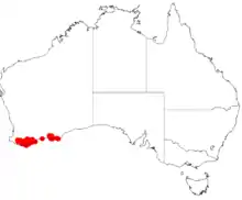 It is native to an area in the South West , Great Southern and Goldfields-Esperance regions of Western Australia where it grows in sandy to gravelly lateritic soils.[3] The shrub is found in a large continuous distribution from the Stirling Range National Park south to the coast and then east to near Jerramungup and Bremer Bay with disjunct populations in several areas further east including around Scaddan and at Lucky Bay in Cape Le Grand National Park.[4] It is often found as part of woodlands or low mallee scrubland communities.[4]