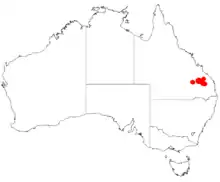 The shrub is native to an area around Cracow in south eastern Queensland in the Dawson River catchment.[1] It is found on the lower slopes of steep sandstone hills and ridges growing in sandy to sandy-clay soils as a pat of dry sclerophyll forest communities as is often associated with species including Corymbia maculata, Corymbia trachyphloia, Eucalyptus crebra, Eucalyptus cloeziana, Eucalyptus citriodora, Corymbia tessellaris, Angophora leiocarpa, Lysicarpus angustifolius, Acacia podalyriifolia and Acacia crassa.[2]