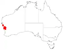 It is native to an area in the Wheatbelt and Mid West regions of Western Australia where it is commonly situated on low rises and sandplains growing in sandy soils.[1] It is found in coastal areas from around the Zuytdorp Cliffs in the north down to around Watheroo in the south extending to about 30 km (19 mi) inland as a part of low open woodland where it is usually associated with Banksia prionotes or in shrubland and heath communities.[2]