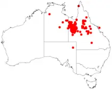 A. chisholmii is found in western parts of Queensland and is quite common in the Mount Isa to Cloncurry area. The plant is found on stony usuallylateritic plains with shallow, sandy soils or in undulating country and on escarpments and s usually part of grassland or Eucalypt and spinifex woodland communities. Smaller populations are found in far eastern parts of the Northern Territory around Lake Nash.[2]