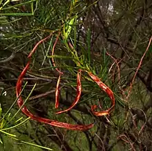 The resinous multi-stemmed shrub has a spreading habit that typically grows to a height of 4 m (13 ft) and has minni ritchi style bark. It has angular, purplish brown or red-brown coloured branchlets that are minutely crenulated with slightly appressed-villous ridges.[2] It flowers between May and August producing golden flower spikes with a length of 13 to 28 mm (0.51 to 1.10 in). After flowering it produces linear, flat seed pods that are constricted between the seeds. The pods have a length of 2.5 to 14 cm (0.98 to 5.51 in) and have pale margins. The dark brown to black seeds within the pods have a narrowly oblong to elliptic shape and have a length of 3.6 to 4.5 mm (0.14 to 0.18 in).[2]