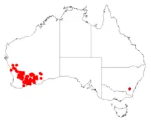 It is native to an area in the Great Southern, Wheatbelt and the Goldfields-Esperance regions of Western Australia where it grows in sandy, loam or clay soils.[1]