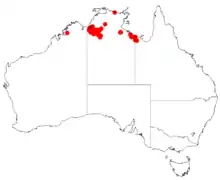 It is found through the top end of the Northern Territory and a small area in north western Queensland[1] where it grows in stony and sandy soils usually on laterite or quartzite aa a part of Eucalypt woodlands or scrubby open forest communities.[3] In Western Australia it is found in small area of the Kimberley region where it grows on sandstone outcrops above creek beds.[2]