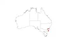 The shrub has a limited distribution about 20 km (12 mi) south of Eden in south western New South Wales with the bulk of the population confined to the Nadgee State Forest and within the boundaries of the proposed Narrabarba Hill Flora Reserve over a range of about 3 km (1.9 mi). Another smaller population in situated in Beowa National Park. The species is found on rocky rhyolite and apatite ridge-tops with nutrient poor skeletal sandy soils but sometimes in brown to black loamy soils. The estimated population is about 6,000 individuals in an area of around 4 ha (9.9 acres).[1]