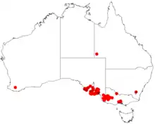The erect, viscid shrub to tree typically growing to a height of 2 to 5 metres (7 to 16 ft). The plant tends to divide near the base to form a series of main stems. It flowers from July to November producing yellow flowers, it fruits from December to January.[2]