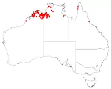 It is native to an area in the Northern Territory and the Kimberley region of Western Australia.[6] Despite records for Queensland,[8] the Commonwealth Heads of Australian Herbaria consider A dunnii not to be native to Queensland, but to have become naturalised.[9] It grows on shallow skeletal sandy soils, over sandstone or quartzite[3][5] Often found on ridges, stony hills and amongst rocks and rocky outcrops.[6]