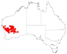 The bulk of the population is found from around Mullewa to the south west with its range extending north to around Meekatharra and east out as far as Goongarrie with several outlying populations. It is usually situated on low hills, around granite outcrops, flats and sandplains where it grows in sandy or loamy soils that can contain a substantial amount of clay as a part of shrubland and spinifex communities that usually contain a number of Eucalyptus and other Acacia species.[2]