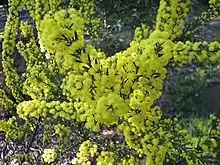 It grows to between 1 and 2 m (3 ft 3 in and 6 ft 7 in) high and had phyllodes up to 16 mm (0.63 in) long and 2 mm (0.079 in) wide. The yellow globular flowerheads arise from the leaf axils in groups of two or singly.[2]
