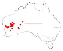 It is native to an area in the Mid West, Wheatbelt and Goldfields regions of Western Australia.[1] It has a scattered distribution with the bulk of the population found from around Yalgoo in the west to the Carnarvon Range in the north east to around Leinster in the east. Outlying populations are located in the Gibson and Great Victoria Deserts. It is often situated on sand dunes and plains growing in a variety of soil types usually as a part of tall open shrubland communities and it is often associated with spinifex.[2]