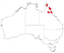 It is found in far north and north eastern Queensland on the Cape York Peninsula and is reasonably common from around Cape Flattery to Cooktown along the coast with populations found as far west as the Iron Range area and down to around Cowley Beach in the south where it is often situated on dunes or in shrubby heathland communities usually often surrounding streams or lagoons growing in sandy soils.[2]