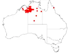 It is native to an area in the Northern Territory and the Kimberley region of Western Australia where it is found on river flats an among gorges growing in sandy and loamy soils over quartzite and sandstone[1] and are often part of Eucalyptus and Heteropogon woodland communities or on savannah grassland communities along with spinifex.[2]