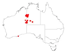 It is native to an area in the Northern Territory and the north eastern Goldfields-Esperance, eastern Pilbara and south eastern Kimberley regions of Western Australia where it is found growing in rocky soils.[2] In the Northern Territory it is found in western areas including the Great Sandy Desert, MacDonnell Ranges, Tanami Desert and Central Ranges where it is usually situated on gravelly or rocky ranges composed of acidic or acidic rocks or upon stony laterite rises and sometimes on sandplains.