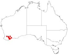 It is native to an area in the Wheatbelt and Great Southern regions of Western Australia where it is found growing in gravelly lateritic soils.[1] The range of the plant extends from around Nyabing to near Boxwood Hill in the west to west of Ravensthorpe in the east where it is often a part of tall, occasionally open, shrubland communities that are often dominated by species of mallee.[2]