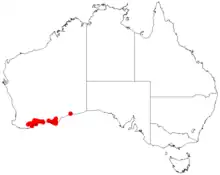 It is native to an area in the Wheatbelt, Great Southern and Goldfields-Esperance regions of Western Australia where it is commonly situated among granite boulders growing in gravelly, sandy granitic soils. The range of the plant extends from Jerramungup and Ravensthorpe in the west[1] to Cape Arid National Park including Middle Island.[2]