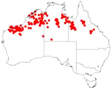 It is native to central and northern parts of the Pilbara region including some of the islands in the Burrup Peninsula and the Dampier Archipelago as well as much of the Kimberley region of Western Australia[2] and the range of the plant extends eastward into the southern part of top end and the central region of the Northern Territory and into Queensland to the Mount Isa, Galilee and Georgetown areas where it is found on rocky hills, along rocky creeks and on sandy flats[3] growing in skeletal sandy or loamy soils[1] as a part of savannah woodland and open Eucalyptus shrubland communities usually with an understorey of spinifex grasses.[3]