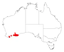 It is native to an area along the south coast in the Goldfields-Esperance region of Western Australia where it is commonly situated on flat or undulating sandplains or along the margins of salt lakes growing in sandy soils over or around limestone[1] or sandy-loamy, clay or gravelly soils The bulk of the population is found from around Young River in the west to around Israelite Bay in the east and extending as far north as 130 km (81 mi) where it is often a part of open shrub mallee over heathland communities.[2]