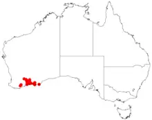It is native to an area in the Great Southern and Goldfields-Esperance regions of Western Australia where it is commonly situated on granite hills and outcrops, rises, low ranges and undulating plains growing in loam, clay, gravelly sandy or loamy sandy soils over or around granite or laterite.[1] The range of the shrub extends from around Frank Hann National Park in the northwest to around Ravensthorpe in the south and out to near Cape Le Grand National Park and Mount Burdett in the east where they are usually a part of low scrub, shrub mallee or heathland communities.[2]