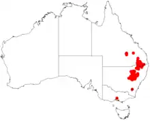 It is endemic from south eastern Queensland from the southern portion of the Darling Downs district and the range extends south to the central western slopes and north western plains of New South Wales as far south as Munghorn Gap Nature Reserve where it is found in a variety of habitat growing in infertile rocky, sandy or gravelly clay soils as a part of open Eucalyptus woodlands or in shrubland communities.[1]