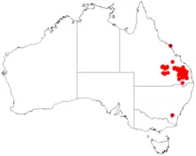 It is endemic to south eastern Queensland where the bulk of the population is found between Cracow, Condamin, Kingaroy and Eidsvold with scattered smaller populations in the Carnarvon National Park and Salvator Rosa National Park. where it grows in sandy to sandy loam soils over sandstone as a part of open Eucalyptus woodland communities.[1]