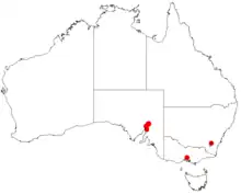It is endemic to a small area in the Flinders Range of South Australia from Quorn to Hawker where it is found on the lower slopes of the range and in rocky gullies growing in calcareous loamy soils as a part of low woodland communities dominated by Callitris glaucophylla.[1] It is locally common but considered rare in South Australia.[2]