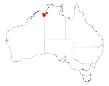 It is native to a small area in the Kimberley region of Western Australia where it is situated on hills, creek beds and in rocky areas where it is found growing in sandstone based soils.[1] It has a limited range from around Kununurra extending eastwards into the top end of the Northern Territory as far as the Keep River National Park.[2]