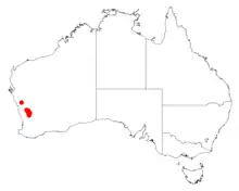 It is native to an area in the Wheatbelt and Mid West regions of Western Australia where it is found growing in yellow coloured sandy or loamy soils.[1] The range of the plant extends from around Ballidu in the south to around Latham in the north where it is usually found as a part of Eucalyptus woodland or open heath communities.[2]