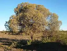 The dense rounded shrub or tree typically grows to a height of 0.8 to 3 metres (3 to 10 ft).[1] The slightly angular and glabrous branchlets are sometimes resinous. The pungent green phyllodes are ascending to erect and slightly incurved. The phyllodes have a length of 5 to 11.5 cm (2.0 to 4.5 in) and a diameter of 1 to 1.3 mm (0.039 to 0.051 in) and have eight closely parallel nerves separated by deep furrows.[2] It blooms from August to September producing yellow flowers.[1] The simple inflorescences are sessile spikes usually tapering towards the apex when budding. The inflorescences have a length of 10 to 28 mm (0.39 to 1.10 in) with a 3 to 5 mm (0.12 to 0.20 in) densely covered in pale golden to dark golden flowers. The linear seed pods that form later are deflexed and raised over but not often constricted between seeds. Each pod is to around 7 cm (2.8 in) in length and a width of 3 to 4.5 mm (0.12 to 0.18 in). The glossy black seeds within the pods are longitudinal with a broadly elliptic to oblong-elliptic shape and have a length of 3 to 4 mm (0.12 to 0.16 in).[2]