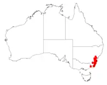 It is found in New South Wales and Victoria on the ranges around the Wolgan River in the north west and along the coast near Nowra in the north east with a range that extends down into Victoria. It is often situated among rocky outcrops as a part of heathland or dry sclerophyll forest communities.[1] In Victoria it is found as far south as the upper Snowy River in the east Gippsland area[3] growing in sandy gravelly soils in and around granite, sandstone and rhyolite.[4]
