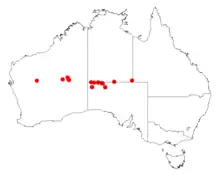 It is native to an area in northern South Australia, southern parts of the Northern Territory and the central Goldfields region of Western Australia where it has a scattered disjunct distribution. It is often situated on low rocky ranges and growing in rocky red soils. In Western Australia it is found from north of Wiluna in the west with a range that extends through the Gibson Desert into South Australia.[2] In South Australia the species is known only from western parts of the far north region in the Everard Ranges and the Birksgate Range from around Mount Lindsay.[5]