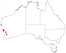 It is native to an area in the Mid West regions of Western Australia where it is commonly situated along the edges of seasonal lakes growing in sandy to sandy-clay soils.[2] It has a limited range near Eneabba especially around Lake Eneabba and is usually a part of low woodland or low open forest communities.[1]