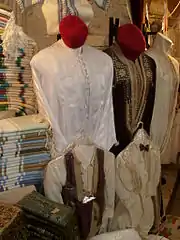 People who choose to buy their dress may opt for finer fabrics, such as poplin, grosgrain, percale, cotton, wool, cassimere, broadcloth, Russell cord, or corded/ribbed material. For silk, there are a range of types including artificial silk/rayon, Ottoman (i.e. ribbed or corded silk), taffeta, satin, alpaca, true silk, shot silk, or a mixture. Pure Ottoman silk is rarely used except for official gowns, as it is very expensive.[10] Some gowns may be trimmed with gimp lace, cords, buttons, or other forms of decoration.