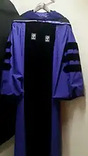 Doctoral gowns are typically black, although some schools use gowns in the school's colors.[2] The Code calls for the outside shell of the hood to remain black in that case. Doctoral gowns have bell sleeves with three velvet bands on them and velvet facing on the front of the gown. The Code calls for the gown trim to be either black or the color designated for the field of study in which the doctorate is earned, with the proviso that the degree of Doctor of Philosophy (Ph.D.) uses the dark blue velvet of philosophy regardless of the particular field studied. (For example, a Ph.D. in theology would wear velvet gown trim in dark blue, a Doctor of Theology (Th.D.) would wear scarlet trim, or either might choose black.) Some gowns expose a necktie or cravat when closed. They are designed to be worn open or closed in the front.[2]