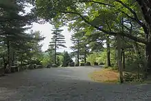 From 1915 to 1940, the wealthy philanthropist John D. Rockefeller Jr. financed, designed, and directed the construction of a network of carriage roads throughout the park.[9] He sponsored the landscape architect Beatrix Farrand, whose family owned a summer home in Bar Harbor named Reef Point Estate, to design the planting plans for the carriage roads (c. 1930).[38] The network originally encompassed about 57 miles (92 km)[8] of crushed stone carriage roads with 17 stone-faced, steel-reinforced concrete bridges (16 financed by Rockefeller), and two gate lodges—one at Jordan Pond and the other near Northeast Harbor.[39] About 45 miles (72 km) of carriage roads are maintained and accessible within park boundaries. Granite coping stones along carriage road edges act as guard rails; they are nicknamed "Rockefeller's Teeth."[9] The carriage roads are open from the end of the spring mud season, generally in late April, through the summer, autumn, and winter months, until the following spring thaw causes another closure in March to prevent damage to the gravel surface.[40][41]