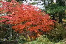 Acer japonicum is a small deciduous tree growing to 5–10 m (rarely 15 m) tall, with a trunk up to 40 cm in diameter. The bark is smooth on young trees, becoming rough and scaly on old trees. The shoots are slender, and thinly downy with whitish hairs. The leaves are rounded, 7–15 cm in diameter with 9–13 (rarely 7) serrate lobes incised to half or less of the diameter of the leaf; they are downy at first with white hairs, the hairs mostly lost by late summer except on the veins and the underside of the leaf; the petiole is 2–4 cm long and hairy. In autumn, the leaves turn bright orange to dark red. The flowers are 1 cm in diameter, dark purplish-red with five sepals and petals; they are produced 10–15 together in drooping corymbs in early spring as the leaves start to open. The fruit is a paired samara with the nutlets 7 mm in diameter with a 20–25 mm wing, hanging under the leaves.[3][4][5]