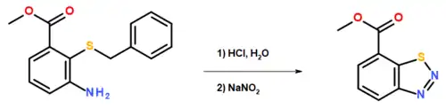 The first synthesis of the parent 1,2,3-benzothiadiazole-7-carboxylic acid was disclosed in patents filed by Ciba-Geigy.[7] The heterocyclic ring of the 1,2,3-benzothiadiazole core is formed by the classic ring-closure of a thiol onto a diazonium group adjacent in its benzene ring.[11] One example from the patent is the diazotisation reaction of 3-amino-2-benzylthiobenzoic acid methyl ester, as its hydrochloride salt, with sodium nitrite in water. This gives 7-methoxycarbonyl-1,2,3-benzothiadiazole in 86% yield after recrystallization.