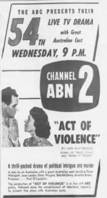 Act of Violence is a 1959 television play broadcast by the Australian Broadcasting Corporation. It was based on a play by Australian writer Iain MacCormick which had previously been broadcast in Britain in 1956. This was typical of Australian television at the time - most locally produced drama consisted of adaptations of overseas stories.[5]