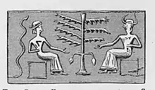 The Adam and Eve cylinder seal, also known as the "temptation seal", is a small stone cylinder of post-Akkadian origin, dating from about 2200 to 2100 BCE. The seal depicts two seated figures, a tree, and a serpent, and was formerly believed to evince some connection with Adam and Eve from the Book of Genesis. It is now seen as a conventional example of an Akkadian banquet scene.[2]