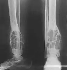 Adamantinoma (from the Greek word adamantinos, meaning "very hard"[1]) is a rare bone cancer, making up less than 1% of all bone cancers.[2] It almost always occurs in the bones of the lower leg[3] and involves both epithelial and osteofibrous tissue.[4]